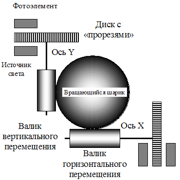 При перемещении мыши по коврику «тяжелый» шарик приходит в движение и вращает соприкасающиеся с ним валики. Ось одного валика вращается горизонтально, а другого - вертикально. На этих осях установлены диски с растровыми отверстиями, которые вращаются между двумя пластмассовыми цоколями. На первом цоколе находится источник света, а на другом - фоточувствительный элемент (фотодиод, фоторезистор или фототранзистор). Этот фотосенсор определяет, где находится источник света; перед отверстием или за пластмассовой перегородкой диска. Поскольку таких перегородок два, то порядок освещения фоточувствительных элементов определяет направление перемещения мыши, а частота приходящих импульсов - скорость.