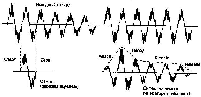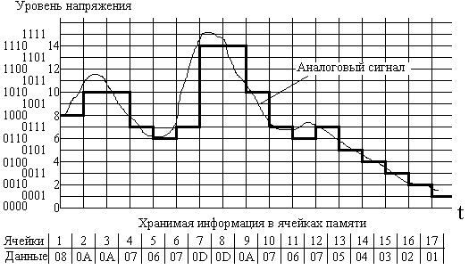 Рис. 1.1.2 Пример оцифровки рисунка Цифровая камера работает, как обычный фотоаппарат, только изображение не попадает на фотопленку, а «запоминается» в электронной памяти такого «фотоаппарата». Потом такой аппарат подключают к компьютеру и по проводу передают сигналы, которыми зашифровано изображение. Если картинка сделана на бумаге, то для того, чтобы превратить её в сигналы, используют сканеры. Картинку кладут в сканер. Сканер просматривает каждую точку этой картинки и передает в компьютер числа (байты), которыми зашифрован цвет каждой точки. Например: Черная точка: 0, 0, 0; Белая точка: 255, 255, 255; Коричневая точка:153, 102, 51; Светло-серая точка: 160, 160, 160; Темно-серая точка: 80, 80, 80. У каждого цвета свой шифр (его называют цветовым кодом). Если каждый цвет передавать тремя байтами, то можно зашифровать более 16 миллионов цветов. Это гораздо больше, чем может различить человеческий глаз, но для компьютера это не предел. Звуковая информацияЗвук, музыка и человеческая речь поступает в компьютер в виде сигналов и тоже оцифровывается (Рис. 1.1.3. Рис. 1.1.4.), то есть превращается в числа, а потом - в байты и биты. Компьютер их хранит, обрабатывает и может воспроизвести (проиграть музыку или произнести слово).