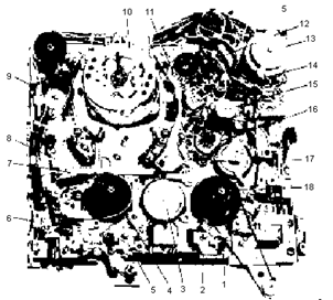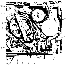 Рис. 2.1.2. Схема непосредственного электрофотополупроводникового копирования: а – электрофотопроводниковая бумага – носитель копии (1 – фотополупроводниковый слой, 2 – электропроводная основа); б – распределение зарядов в носителе копии; в – экспонирование фотополупроводникового слоя (стрелками обозначены световые лучи); г – носитель копии после экспонирования; д – проявление скрытого изображения (черными кружками обозначены частицы красящего порошка); е – носитель копии с закрепленным изображением (чёрными прямоугольниками обозначены расплавленные частицы порошка, прилипшие к основе носителя). Электрографическое копирование осуществляется в электрофотографических аппаратах с применением промежуточных носителей информации и получения копий на обычных бумагах и в аппаратах с получением копий на электрофотополупроводниковой бумаге. Аппараты электрографического копирования различают: ¨ По способам экспонирования; ¨ По способам проявления (“мокрое” и “сухое”) и закрепления изображения; ¨ По форматам оригинала и копии; ¨ По степени автоматизации и т.д. Экспонирование в аппаратах переносного копирования с “посредником” в виде пластины производится статическим способом – отдельными кадрами; в аппаратах с “посредником” в виде цилиндра или ленты применяют динамические способы (при котором оригинал, оптическая система и поверхность “посредника” непрерывно перемещаются относительно друг друга). Продолжительность экспонирования зависит от освещенности оригинала, светочувствительности фотополупроводника, качества оптической системы. 2.1.2. Принципы работы современных аналоговых копировальных аппаратовПроцесс сухого электростатического копирования, ставший фактическим стандартом для офисной копировальной техники, состоит из следующих этапов: 1. Предварительная зарядка отрицательным потенциалом фоточувствительного барабана. 2. Проецирование изображения на барабан таким образом, чтобы лучи, отраженные от светлых участков оригинала, нейтрализовали соответствующие области фоторецептора, оставляя отрицательно заряженными лишь те части барабана, на которые в дальнейшем будет накладываться тонер для переноса на бумагу. 3. Перенос частиц тонера с магнитного вала узла проявки на отрицательно заряженные участки поверхности фотобарабана. 4. Перенос тонера с барабана на бумагу. 5. Отделение бумаги от барабана. 6. Термическое закрепление копии. Сердцем копировального аппарата является фотобарабан, называемый также просто барабаном или драмом. Часто фотобарабан рассматривается целиком - как неразделимый узел, включающий в себя: Ø несущие крепления Ø ракель для счистки отработанного тонера Ø бункер, куда этот тонер попадает после снятия с барабана Ø коротрон переноса Ø лампы предварительной засветки и бланкирования Ø специальные печатные платы барабана и т. п. В таких случаях он называется узлом барабана, драм - картриджем или драм - юнитом. Основная функциональная часть фотобарабана светочувствительный слой, в котором при попадании фотонов света формируется скрытое электростатическое поле, представляющее собой точную проекцию оригинала, первоначально отразившего этот свет. Примечание:В отдельных моделях копировальных аппаратов встречаются некоторые модификации подобной конструкции. В Ricoh M-50, к прим