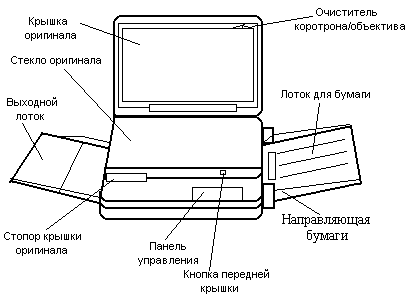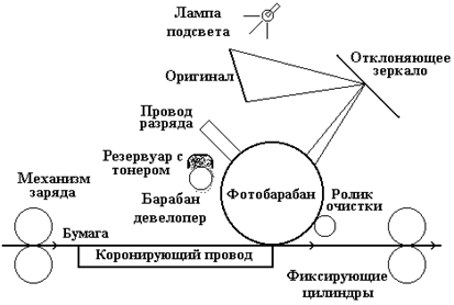 УстройствоСостав:1. Крышка оригинала; 2. Стекло оригинала; 3. Выходной лоток; 4. Лоток для бумаги; 5. Направляющие бумаги; 6. Панель управления; 7. Отклоняющее зеркало; 8. Фотобарабан; 9. Ролики очистки; 10. Резервуар с тонером; 11. Барабан девелопер; 12. Провод разряда; 13. Коронирующий провод; 14. Фиксирующий цилиндр. Принцип работы (Рис. 2.1.4)
