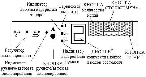Рис. 2.1.4. Функциональная схема ксерокса Важнейшим конструктивным элементом ксерокса является вращающийся барабан, с помощью которого производится перенос изображение на бумагу. Барабан представляет собой металлический цилиндр, покрытый тонкой пленкой светопроводящего полупроводника (оксида цинка). На поверхности барабана равномерно распределяется статический заряд. Для этого служит тонкая проволока, называемая коронирующим проводом. На этот провод подается высокое напряжение, вызывающее вокруг него светящуюся ионизированную область называемой короной. Отраженное изображение от оригинала проходит через щель, отклоняющее зеркало и попадает на вращающийся барабан. Под действием лучей света полупроводниковый слой барабана изменяет электрический заряд. Таким образом, на барабане возникает скрытая копия изображения. На следующем рабочем шаге, на фото-барабан наносится тонер (мельчайшая красящая пыль). Под действием статического заряда эти мелкие частицы легко притягиваются к поверхности барабана в точках, подвергнувшихся экспозиции, и формируется видимое изображение. Бумага втягивается из подающего лотка и с помощью системы валиков перемещается к барабану. Перед барабаном бумаге сообщается статический заряд. Бумага под действием заряда соприкасается с барабаном и притягивает, благодаря заряду, частицы тонера от барабана. Для фиксации тонера, бумага пропускается между двумя нагретыми до температуры около 180 0 С роликами. После процесса печати барабан полностью разряжается и очищается от прилипших частиц. Панель управленияПанель управления предназначена для управления процессом копирования и изменения режимов работы копировальной машины (Рис. 2.1.5.).