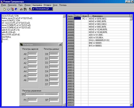 возможен одновременный просмотр всех регистров, памяти, ввод команд в