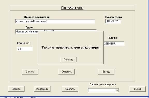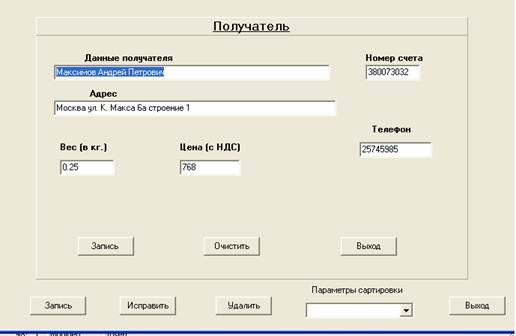 Непосредственно ввод данных о получателе осуществляется в отдельном окне “Получатель”, где пользователь представляется возможность заполнения каждого из предложенного полей. Кнопка «Запись» осуществляет запись в базу данных Получатель. Процесс редактирования данных происходит в том же самом окне, при нажатии на кнопку «Исправить», в этом же окне происходит уведомление пользователя о недопустимых ошибках. Кнопка «Удалить» позволяет удалить запись из базы Получатель. При необходимости упорядочивания данных, по какому – либо из полей, был предусмотрен выплывающий список выбора параметров сортировки. И, наконец, для завершения работы с формой “Получатель”, достаточно нажать кнопку «Выход», или кнопку закрытия окна, и пользователь попадает на форму главного меню.