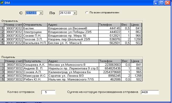 По нажатию на кнопку “По всем отправителям”, происходит вывод данных по всем имеющимся отправкам за указанный промежуток времени. Данные выводятся в две таблице. Первая таблица – таблица отправителя. Вторая – получателя. Под таблицей выводятся количества отправок и общая сумма, на которую произведены отправки. Пункт меню “Найти” здесь появляется окно, в которое мы вводим организацию или фамилию отправителя и получаем уже имеющиеся в базе ранее данные об этом отправителе и выводится также те места, куда он ранее производил отправки. Пункт меню “Справка” содержит пункт вызова справки и сведения о программе. Пункт меню “Выход” – завершает работу с данной программой. 8. Инсталляция программы . Для установки программы на компьютер пользователя используется процесс инсталляции. Создания инсталлятора было необходимо потому, что компьютер пользователя не содержал некоторых системных файлов и баз, необходимых при работе с Delphi. А так как программа написана на этом языке и имеет дело с базами, то и работа без этих файлов была невозможна. Поэтому было необходимо либо установить на компьютер пользователя либо саму программу Delphi, либо создать инсталлятор с помощью InstallShield Express Forr Delphi 5 включить необходимые базы в процессе инсталляции. После установки приложения на компьютер, с пользователем была проведена работа по обучению эксплуатации данной программы.