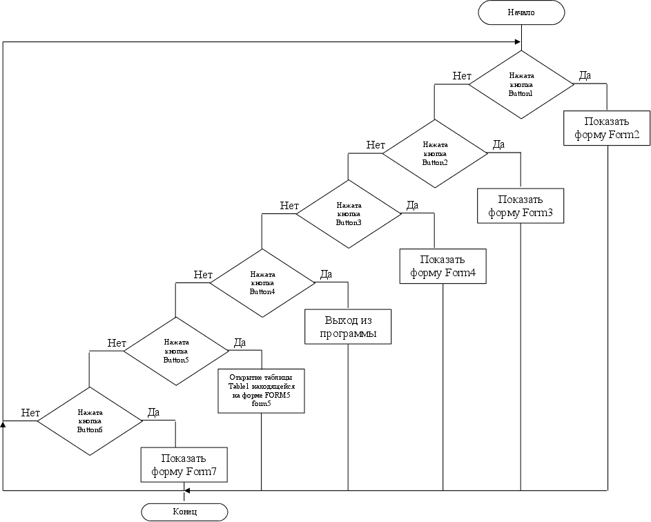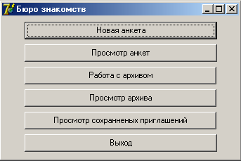 Реферат: База данных Бюро знакомствРеферат: База данных Бюро знакомствМІНІСТЕРСТВО ОСВІТИ І НАУКИ УКРАЇНИ НАЦІОНАЛЬНИЙ УНІВЕРСИТЕТ КОРАБЛЕБУДУВАННЯ ім. адм. Макарова Херсонський філіал Кафедра інформаційних технологій Курсова робота З ДИСЦИПЛІНИ “Об’єктно – орієнтоване програмування” ТЕМА: Розробка програмного забезпечення “Бюро знайомств” Виконав: Перевірив: Херсон 2004 Ход работы программы Модуль Proect1 содержит информацию о всех 7-ми Формах. Форма 1 (Unit1) состоит из 6-ти кнопок и хранит процедуры их обработки: