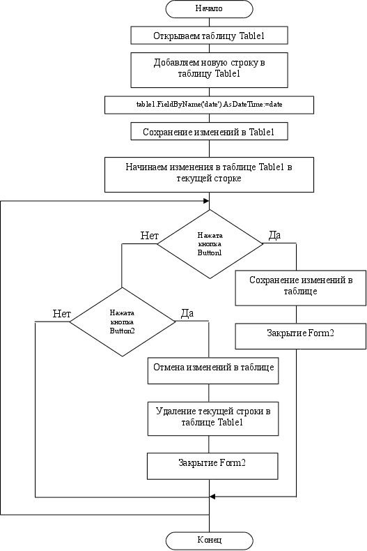 unit Unit2; interface uses Windows, Messages, SysUtils, Variants, Classes, Graphics, Controls, Forms, Dialogs, DBCtrlsEh, Mask, DBCtrls, DB, DBTables, StdCtrls, Buttons; type TForm2 = class(TForm) Label1: TLabel; Label2: TLabel; Label3: TLabel; Label4: TLabel; Label5: TLabel; DBMemo1: TDBMemo; DBMemo2: TDBMemo; Table1: TTable; DataSource1: TDataSource; DBEdit1: TDBEdit; DBEdit2: TDBEdit; DBEdit3: TDBEdit; DBEdit4: TDBEdit; DBDateTimeEditEh1: TDBDateTimeEditEh; DBEdit5: TDBEdit; Label6: TLabel; Label7: TLabel; BitBtn1: TBitBtn; BitBtn2: TBitBtn; DBEdit6: TDBEdit; Label8: TLabel; procedure FormCreate(Sender: TObject); procedure BitBtn1Click(Sender: TObject); procedure BitBtn2Click(Sender: TObject); procedure FormClose(Sender: TObject; var Action: TCloseAction); private { Private declarations } public { Public declarations } end; var Form2: TForm2; implementation uses Unit3; {$R *.dfm} procedure TForm2.FormCreate(Sender: TObject);//При показе, активации и создании формы Form2 выполняются действия: begin Table1.Open;//Открывается таблица Table1 table1.Append;//Добавляется в конец таблицы новая строка в таблицу Table1 table1.FieldByName('date').AsDateTime:=date;//Записываем в текущую строку в поле Date сегодняшнее число table1.Post; //Сохранение изменений table1.edit; //Начинаем изменения в таблице Table1 в текущей сторке end; procedure TForm2.BitBtn1Click(Sender: TObject);//Процедура обработки клика кнопки "ОК" begin table1.Post; //Сохранение изменений close;//Закрытие формы Form2 end; procedure TForm2.BitBtn2Click(Sender: TObject); begin table1.Cancel;//отмена изменений table1.Delete;//Удаление текущей строки в таблице Table1 close;//Закрытие формы Form2 end; procedure TForm2.FormClose(Sender: TObject; var Action: TCloseAction);//Процедура обработки событя при закрытии формы Form2 begin form3.Table1.Refresh;//Обновление данных в таблице Table1 находящейся на форме Form3 end; end.