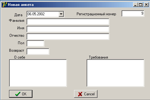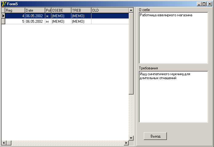 Для корректировки и просмотра открытой таблицы имеются команды ТаЫе/Restructure (кнопка Restructure) и ТаЫе/Into Structure. Для переименования таблицы следует сохранить ее под новым именем. Для заполнения и редактирования таблицы, после ее связывания с другими таблицами, испочьзуется кнопка Edit Data и меню Record приложения Database Deskot (кириллицу при вводе использовать нельзя). Сведения о бюро знакомств С судьбой можно встретиться еще в школе. Или в институте. Можно выйти замуж за кучерявого брюнета из соседнего дома или познакомиться с будущей женой в очереди за жетончиками метро. Вариантов масса. Но даже если все варианты испробованы, а своего единственного вы еще не встретили, остается еще один вариант - знакомство через Бюро знакомств. Бытует мнение, что в службу знакомств обращаются в основном несчастные, никому ненужные люди. Конечно, можно еще подумать, а можно отнестись к проблеме более целеустремленно. На самом деле это люди с активной жизненной позицией, которые смогли побороть в себе какие-то комплексы и решили попробовать цивилизованный способ знакомства. Бюро знакомств уже не первый год успешно работает на рынке брачных услуг, имеет очень много положительных результатов, и у каждого есть свой шанс найти спутника жизни. Названию "брачное агентство" лучше предпочесть более нейтральное - "служба знакомств". Это позволит избегать трудновыполнимых обещаний, поскольку каких-либо гарантий в деле устройства чьей-то судьбы просто не существует. Брачный бизнес - это коммерческая, то есть платная, подразумевающая получение дохода, деятельность, связанная с предоставлением услуг в сфере брачных знакомств. Организациями, занимающимися данным видом деятельности и предоставляющими услуги в этом виде бизнеса, являются брачные агентства и службы знакомств. Кроме организаций, в брачном бизнесе активно работают и индивидуальные брачные дилеры, в прошлом - брачные свахи. Применение программы на практике С давних времен люди искали себе спутников жизни на протяжении долгого времени. Постепенно стали появляться фирмы, помогающие людям найти себе партнера, так называемые “службы знакомств”. Люди приходили в эти службы, заполняли анкеты, оставляя данные о себе, оставляли так же и требования к человеку, которого хотели бы найти. Так же приходили в бюро знакомств люди, которые хотели не только зарегистрироваться, но и поискать спутника или спутницу в уже существующей базе. В этих службах велась огромная документация, хранившая адреса, фотографии, номера телефонов, личные данные своих клиентов. Следовательно, чтобы найти кого-то, нужно было пересмотреть и отсортировать сотни, а то и тысячи бумаг. Моя задача – облегчить поиск и подбор желающих познакомиться с новыми людьми через бюро знакомств. Программа, написанная мной, может хранить данные о личности, такие как ФИО, возраст, пол, дату регистрации, описания внешности и других характеристик клиента, а так же требования, удовлетворяющие желание клиента в поиске избранницы либо избранника. Реализован поиск по регистрационному номеру, что удобно как для работника бюро знакомств (для сортировки анкет), так и для клиентов. Клиент может зарегистрироваться, оставив анкету в бюро знакомств, и автоматически получить регистрационный номер, что поможет при объявлении в той же газете. Введя определённый регистраци