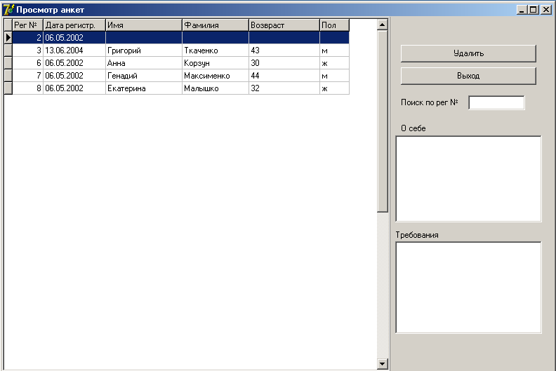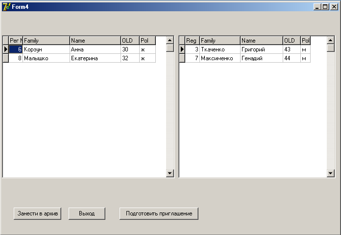 Таблица Люди, будет иметь столбцы: Люди, Регистрационный номер, Дата регистрасии, Пол, О себе, Требования, Возраст, ФИО. Вторая таблица – Архив будет иметьаналогичные названия столбцов.