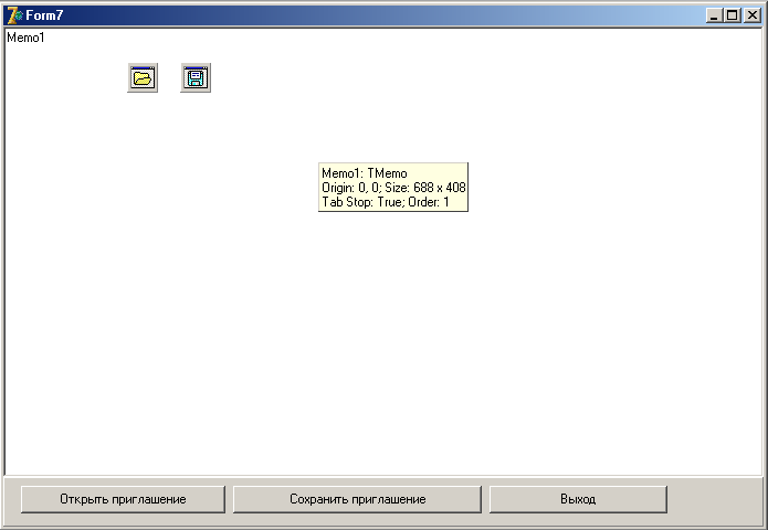 unit Unit7; interface uses Windows, Messages, SysUtils, Variants, Classes, Graphics, Controls, Forms, Dialogs, StdCtrls, ExtCtrls; type TForm7 = class(TForm) OpenDialog1: TOpenDialog; SaveDialog1: TSaveDialog; Panel1: TPanel; Memo1: TMemo; Button1: TButton; Button2: TButton; Button3: TButton; procedure Button3Click(Sender: TObject); procedure Button1Click(Sender: TObject); procedure Button2Click(Sender: TObject); private { Private declarations } public { Public declarations } end; var Form7: TForm7; implementation {$R *.dfm} procedure TForm7.Button3Click(Sender: TObject); begin Close;//Закрытие формы Form7 end; procedure TForm7.Button1Click(Sender: TObject); begin If OpenDialog1.Execute then memo1.Lines.LoadFromFile(OpenDialog1.FileName);//Открываем окно диалога открытия файла и заполняем текстовую область Memo1 из указанного файла end; procedure TForm7.Button2Click(Sender: TObject); begin If SaveDialog1.Execute then memo1.Lines.SaveToFile(SaveDialog1.FileName);//Открываем окно диалога сохранения файла и сохраняем текстовую область Memo1 в указанный файл end; end.