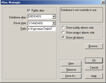 как Для создания псевдонима выполним команду Тоо1s/Аlias Мапаger, и появится окно Аlias Маnаgег. Нажмем кнопку New и в поле Database alias введем имя псевдонима Учет, кнопкой Вrowse выберем наш каталог с базой Люди, далее Кеер New и ОК. Командой File/Working Directory установим текущий каталог, выбрав псевдоним Курсовая в списке Alias, займемся созданием таблиц.