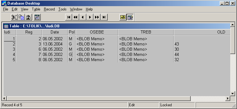 unit Unit3; interface uses Windows, Messages, SysUtils, Variants, Classes, Graphics, Controls, Forms, Dialogs, StdCtrls, DBCtrls, Grids, DBGrids, Buttons, ExtCtrls, DB, DBTables; type TForm3 = class(TForm) DataSource1: TDataSource; Table1: TTable; Panel1: TPanel; DBGrid1: TDBGrid; DBMemo1: TDBMemo; DBMemo2: TDBMemo; Button1: TButton; Button2: TButton; Label1: TLabel; Label2: TLabel; Edit1: TEdit; Label3: TLabel; procedure FormCreate(Sender: TObject); procedure BitBtn1Click(Sender: TObject); procedure Button2Click(Sender: TObject); procedure Edit1Change(Sender: TObject); private { Private declarations } public { Public declarations } end; var Form3: TForm3; implementation {$R *.dfm} procedure TForm3.FormCreate(Sender: TObject); //прцедура обработки события при создании формы Form3 begin table1.Open;//Открытие таблицы table1 end; procedure TForm3.BitBtn1Click(Sender: TObject);//Процедура обработки клика кнопки "Удалить" begin table1.Delete;//Удаление текущей строки в таблице Table1 end; procedure TForm3.Button2Click(Sender: TObject);//Процедура обработки клика кнопки "Выход" begin Close;//Закрытие Form3 end; procedure TForm3.Edit1Change(Sender: TObject); begin Try //Задействование обработчика ошибок Table1.FindKey([strtoint(edit1.Text)]); //Поиск по индексу (ставит курсор в таблице ближе всего находящейся к искомому значению) except Showmessage('Не верный параметр для поиска'); //в солучае возникновения ошибки будет дано сообщение end; end; end.