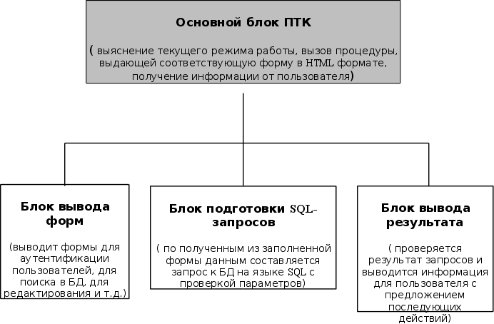 Сервер включен в локальную сеть, содержащую множество различных типов компьютеров (от Sun SPARKstation до i386) и других серверов (под управлением различных версий UNIX и NetWare). Аппаратное обеспечение сервера вполне справляется с нагрузкой, обеспечивая хорошее время реакции. Эти требования не являются минимально допустимыми, но тестирование на других конфигурациях сервера не проводилось. Требования к надежности.Для обеспечения устойчивого функционирования ПТК проверяются входные данные. При аварийном завершении программы система возвращается в первоначальное состояние, для чего имеется специальная процедура, реагирующая на соответствующий сигнал (аналог программного прерывания в DOS). При отказе время восстановления зависит от сложности неисправности. В случае программного сбоя время восстановления равно времени, нужному перезагрузки сервера. При аппаратном сбое оно равно времени восстановления информации с резервной копии. Дополнительные требования.Для работы с ПТК к квалификации персонала не предъявляется особенных требований. Единственный необходимый навык- умение работы с программой просмотра для WWW. Для занесения информации в БД планируется задействовать одного человека. Необходимо периодическое резервное копирование информации для чего написана программа, экспортирующая содержимое БД в текстовые файлы и программа восстановления. Это выполняется системным администратором по мере необходимости. Компьютер клиента может быть практически любой и необходимым требованием является лишь подключение к Сети и наличие браузера, поддерживающего HTML версии 2.0 (программа просмотра Netscape Navigator подходит как нельзя лучше, тем более существуют её модификации для множества аппаратных платформ и операционных систем при схожести интерфейса). Эскизный проект структуры ПО ПТК.На представленном ниже эскизе представлены основные блоки ПТК. В скобках указаны основные функции, выполняемые блоками. Это эскиз, использованный при начальной стадии разработки.