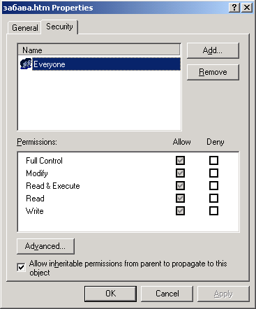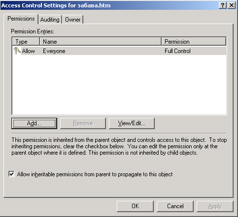 Если оставлен установленный по умолчанию флажок Allow Inheritable Permissions From Parent To Propagate To This Object (Переносить наследуемые от родительского объекта разрешения на этот объект) со вкладки Security (Безопасность) в диалоговом окне файла или папки, разрешение передается от родительского объекта (папки, содержащей данную папку или файл) «по наследству». Если сам родительский объект имеет такую пометку, разрешение передается от его родительского объекта и т. д. У объекта может быть огромная коллекция наследованных и явно указанных разрешений (тех, у которых разрешения были изменены или добавлены). Наследованные разрешения обозначены в затененных полях столбцов Allow (Разрешить) и Deny (Запретить), остальные разрешения помещены в обычных полях.[4]