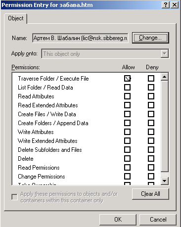 1. Вывести на экран вкладку Security (Безопасность) для папки и установить разрешения для всех пользователей, как было описано выше. Не следует щелкать на кнопке OK , чтобы не закрыть окно.