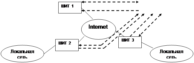 Внешний маршрутизатор защищает от сети internet как экранированную подсеть, так и внутреннюю сеть. Он должен пересылать трафик согласно следующим правилам: ·разрешается трафик от объектов internet к прикладному шлюзу; ·разрешается трафик от прикладного шлюза к internet; ·разрешается трафик электронной почты от internet к серверу электронной почты; ·разрешается трафик электронной почты от сервера электронной почты к internet; ·разрешается трафик FTP, Gopher и т.д. от internet к информационному серверу; ·запрещается остальной трафик. Внешний маршрутизатор запрещает доступ из internet к системам внутренней сети и блокирует весь трафик к internet, идущий от систем, которые не должны являться инициаторами соединений (в частности, информационный сервер и др.). Этот маршрутизатор может быть использован также для блокирования других уязвимых протоколов, которые не должны передаваться к хост-компьютерам внутренней сети или от них. Внутренний маршрутизатор защищает внутреннюю сеть как от Internet, так и от экранированной подсети. Внутренний маршрутизатор осуществляет большую часть пакетной фильтрации. Он управляет трафиком к системам внутренней сети и от них в соответствии со следующими правилами: · разрешается трафик от прикладного шлюза к системам сети; · разрешается прикладной трафик от систем сети к прикладному шлюзу; · разрешает трафик электронной почты от сервера электронной почты к системам сети; · разрешается трафик электронной почты от систем сети к серверу электронной почты; · разрешается трафик FTP, Gopher и т.д. от систем сети к информационному серверу; · запрещает остальной трафик; Чтобы проникнуть во внутреннюю сеть при такой схеме межсетевого экрана, атакующему нужно пройти два фильтрующих маршрутизатора. Даже если атакующий каким-то образом проник в хост-компьютер прикладного шлюза, он должен еще преодолеть внутренний фильтрующий маршрутизатор. Таким образом, ни одна система внутренней сети не достижима непосредственно из Internet, и наоборот. Кроме того, четкое разделение функций между маршрутизаторами и прикладным шлюзом позволяет достигнуть более высокой пропускной способности. Прикладной шлюз может включать программы усиленной аутентификации. Межсетевой экран с экранированной подсетью имеет и недостатки; ·пара фильтрующих маршрутизаторов нуждается в большом внимании для обеспечения необходимого уровня безопасности. поскольку из-за ошибок при их конфигурировании могут возникнуть провалы в безопасности всей сети; ·существует принципиальная возможность доступа в обход прикладного шлюза. Применение межсетевых экранов для организации виртуальных корпоративных сетей Некоторые межсетевые экраны позволяют организовать виртуальные корпоративные сети. Несколько локальных сетей, подключенных к глобальной сети, объединяются в одну виртуальную корпоративную сеть. Передача данных между этими локальными сетями производиться прозрачным образом для пользователей локальных сетей. Конфиденциальность и целостность передаваемой информации должны обеспечиваться при помощи средств шифрования, использование цифровых подписей. При передаче данных может шифроваться не только содержимое пакета, но и некоторые поля заголовка.