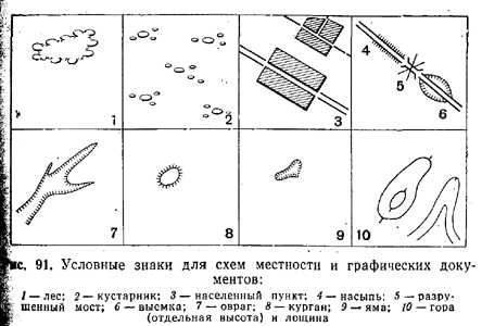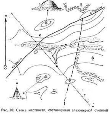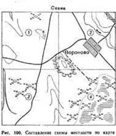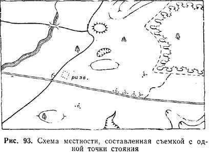 На лист бумаги наносят точку стояния так, чтобы снимаемый участок поместился на этом листе. Например, если мы стоим в центре снимаемого участка, то и точку стояния следует обозначить в центре листа бумаги; если стоим в одном из углов или на краю участка, то и точку на бумаге следует поставить в соответствующем углу или на краю листа бумаги. Затем, сориентировав лист бумаги относительно снимаемого участка, закрепляют его на каком-либо предмете (пне, перилах моста, бруствере окопа) и, не сбивая положения листа, проводят съемку. Если приходится работать, держа лист бумаги в руке, то сначала прочерчивают на нем направление сервер—юг. Для этого, сориентировав лист бумаги относительно снимаемого участка, кладут на него компас, отпускают тормоз стрелки и, когда стрелка успокоится, прочерчивают линию, параллельную стрелке компаса. В дальнейшем следят за тем, чтобы направление стрелки компаса точно совпадало с прочерченной линией север—юг. Когда потребуется ориентировать чертеж заново, например после перерыва в работе, на него накладывают компас так, чтобы деления 0° (С) и 180° (Ю) совпали с прочерченным направлением север—юг, затем поворачивают чертеж до тех пор, пока северный конец стрелки компаса не встанет против деления 0° (С). В таком положении чертеж будет ориентирован, и на нем можно продолжать работу. Для того чтобы нанести на чертеж тот или иной предмет, надо после ориентирования листа приложить к означенной на нем точке стояния линейку (карандаш) и поворачивать ее около точки до тех пор, пока направление линейки не совпадет с направлением на предмет. Три таком положении линейки прочерчивают вдоль нее прямую линию от точки стояния; эта линия и будет направлением, на котором находится наносимый на схему предмет. Так последовательно наводят линейку на все остальные предметы и прочерчивают направления на каждый из них. Затем определяют расстояния до предметов и откладывают их на соответствующих направлениях от точки стояния в масштабе чертежа или приближенно, сохраняя примерное соотношение этих расстояний на чертеже и на местности. Полученные на направлениях точки укажут местоположение предметов на чертеже. В местах точек вычерчивают условные знаки нанесенных предмета, относительно которых глазомерно наносят остальные детали местности, находящиеся непосредственно около точки стояния, а также расположенные между нанесенными ориентирами или около них. На схеме местности таким способом нанесены отдельные деревья, кусты у дороги, участок улучшенной грунтовой дороги, развалины, яма и др.