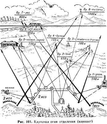 Местные предметы и рельеф в районе позиции отделения показывают на карточке топографическими условными знаками, а месгные предметы, служащие ориентирами и находящиеся перед передним краем обороны, зарисовывают так, как они видны на местности. Сверху на поле карточки делается подпись “Карточка огня... отделения... взвода”, внизу “Командир отделения (звание, подпись)”, затем проставляются время и дата составления карточки. Карточка огня используется в бою при постановке огневых задач, целеуказании и подаче команд на открытие огня (при управлении огнем). Последовательность работы при составлении карточки огня такая. Встав лицом к противнику и держа перед собой полевую книжку (или лист бумаги) верхним обрезом параллельно переднему краю обороны, ориентируются по сторонам горизонта и прочерчивают на краю листа стрелку север — юг. Внизу листа бумаги обозначают точку своего стояния с таким расчетом, чтобы весь чертеж уместился на одной странице. Для этого следует мысленно представить размещение на бумаге сначала наиболее удаленных, а затем и ближних ориентиров. Потом наносят на карточку способом кругового визирования выбранные ориентиры. Рядом с изображением ориентира подписываются его номер, название и расстояние до него. Первым наносят наиболее удаленный ориентир. Прочерченное направление на него в дальнейшем можно использовать для ориентирования чертежа, а отложенное расстояние до удаленного ориентира служит как бы масштабом для определения местоположения других ориентиров при нанесении их на чертеж.