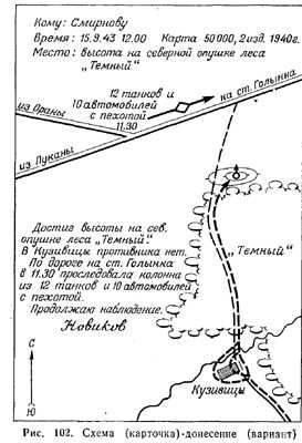 На схеме (карточке) —донесении местность изображается так, чтобы, пользуясь характерными местными предметами и их названиями, можно было изображенную на ней местность найти на карте, т. е. привязать схему (карточку) к карте. Например, при изображении населенного пункта надо указать его название; при изображении дороги показать ее топографическим условным знаком, подписать, откуда и куда она идет, указать название реки, стрелкой направление ее течения и т. д. Сведения, которые не могут быть выражены графически, сообщаются письменно на полях или на обороте схемы (карточки). Такое графическое донесение дает возможность старшему начальнику знать, как выполняется задача подразделением по времени и месту, своевременно принять решение и дать указания подчиненным. На схеме (карточке) — донесении обычно отображается небольшой по площади участок местности, поэтому она составляется, как и карточка огня, методом кругового визирования с одной точки стояния. Этим же методом составляют и другие графические донесения, а также отчетные графические документы (схемы, карточки). Отчетные схемы (карточки)
