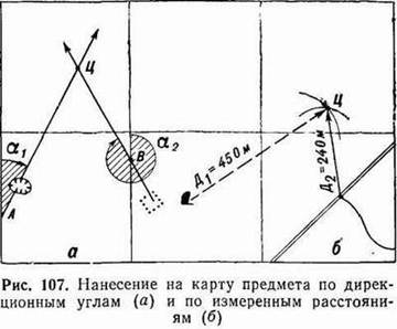 Правильность засечки по возможности следует проверять проведением направления на объект с третьей точки стояния. Если все три линии пересекутся в одной точке, засечка вер на. Если в пересечении получается небольшой треугольник погрешности, то искомую точку располагают в его центре. В отдельных случаях, обусловленных обстановкой, засечку можно выполнить измерением магнитных азимутов на определяемый объект. Измеренные азимуты переводят в дирекционные углы, выполняют по ним необходимые построения на карте и определяют местоположение объекта.