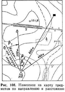 Засечкой можно нанести объект на карту и по измеренным (известным) расстояниям от двух исходных точек. В этом случае достаточно отложить раствором циркуля известные расстояния в масштабе карты от каждой исходной точки до объекта и сделать засечку этими радиусами. По направлению и расстоянию нанесение объекта на карту производится в тех случаях, когда он виден только с одной исходной точки. На ориентированной карте прочерчивают направление от точки стояния на определяемый объект. Определив расстояние до него, откладывают это расстояние по прочерченному направлению и получают положение объекта на карте. Если по условиям обстановки нет возможности работать с картой непосредственно на точке стояния, то для нанесения на карту предметов, видимых с точки стояния, можно поступить так: — выбрать направление на какой-либо предмет, изображение которого есть на карте; — от этого направления, принятого за начальное, измерить углы на предметы (pi, рз, Рз), которые надо нанести на карту, и определить расстояния до них. Получив на местности такие данные, приступают к работе на карте: · вначале прочерчивают на карте направление с точки стояния на выбранный ориентир (начальное направление); · затем откладывают измеренные углы от начального направления на наносимые предметы и прочерчивают направления; отложив на этих направлениях расстояния до предметов, получают их местоположение на карте.