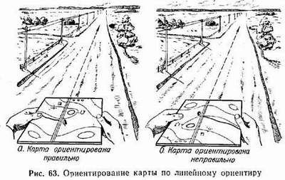 Углы от направления, выбранного за начальное, можно измерить компасом путем последовательного визирования от начального направления на все предметы, которые необходимо нанести на карту. При этом компас надо установить так, чтобы нулевое деление шкалы было обращено строго на начальный ориентир; значения измеряемых углов определяют вращением целика и мушки от одного предмета к другому. Изложенные приемы и способы нанесения на карту местных предметов используют и при нанесении на карту данных о противнике, его оборонительных сооружений, огневых позиций, а также границ зараженных участков местности. Эта задача облегчается тем, что тактические объекты можно наносить, используя уже показанные на карте местные предметы. Например, если известно, что траншея проходит по опушке леса, пулемет расположен у отдельного дерева, а противотанковая пушка — у сарая, то для нанесения этих объектов не требуется проводить направления и измерять расстояния. Достаточно показать эти объекты соответствующими обозначениями рядом с условными знаками местных предметов, у которых они расположены. При нанесении на карту объекта, имеющего значительную протяженность (траншея, новая дорога, линия связи), сначала одним из изложенных выше способов определяют поворотные точки (изгибы), а затем по ним наносят начертание всего объекта. ЗаключениеОриентировать карту—это значит расположить ее в горизонтальной плоскости так, чтобы северная (верхняя) сторона рамки карты была обращена на север. При таком положении карты расположение местных предметов и форм рельефа на местности будет соответствовать расположению условных знаков на карте Ориентирование карты может быть выполнено по линейному ориентиру или направлению на ориентир, когда на карте заранее известно свое местоположение (точка стояния). Если точка стояния неизвестна, карту ориентируют по сторонам горизонта По линейному ориентиру карта может быть ориентирована приближенно или точно. Для приближенного ориентирования достаточно повернуть карту так, чтобы мысленно проведенное от точки стояния направление вдоль условного знака линейного ориентира на карте, например дороги, совпало с направлением этого ориентира на местности. Приближенное ориентирование карты выполняют чаще всего на марше при сличении карты с местностью в движении и контроле за прохождением заранее намеченных или выбранных ориентиров—перекрестков и развилок дорог, мостов, населенных пунктов и других характерных объектов. Свое местоположение на карте в таком случае определяют также приближенно, на глаз. Для точного ориентирования карты используют визирную линейку или карандаш. Приложив линейку к условному знаку линейного ориентира, например дороги, совмещают ее направление с направлением этого ориентира на местности. Затем проверяют, все ли местные предметы и формы рельефа, расположенные на местности справа и слева от дороги, имеют такое же расположение на карте. Если это условие выполнено, карта ориентирована правильно.