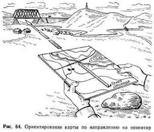 По направлению на ориентир карту ориентируют так ке, как и по линейному ориентиру. Отличие состоит лишь в том, что вместо линейного ориентира используют направление от точки стояния на какой-либо удаленный местный предмет (отдельное дерево, мост, ретранслятор, т. е. точечный ориентир), надежно опознанный на местности и на карте. При приближенном ориентировании карты этим способом ее поворачивают в горизонтальном положении так, чтобы мысленно проведенное на карте направление от точки стояния на условный знак местного предмета примерно совпало с этим направлением на местности. Точное ориентирование карты по направлению на удаленный местный предмет (ориентир) выполняют с помощью визирной линейки или карандаша. Линейку прикладывают на карте боковой гранью к точке стояния (отдельный камень) и условному знаку того предмета, по направлению на который ориентируют карту (железнодорожный мост). Затем поворачивают карту в горизонтальном положении так, чтобы предмет на местности оказался на линии визирования. В таком положении карта будет ориентирована точно.