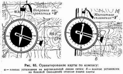 По компасу карту ориентируют, когда не определено свое местоположение на ней или с точки стояния не видно ориентиров. При приближенном ориентировании карты вначале по компасу определяют направление на север, затем поворачивают карту так, чтобы верхняя сторона рамки была обращена в сторону севера. При точном ориентировании карты по компасу вначале указатель отсчета компаса устанавливают против деления шкалы, равного поправке направления, если компас устанавливают на вертикальной линии километровой сетки, или величине магнитного склонения, если компас устанавливают на западную или восточную сторону рамки карты. Если поправка направления (магнитное склонение) положительная (восточное), указатель отсчета устанавливают вправо от нулевого деления шкалы, а если отрицательная (западная)—влево.