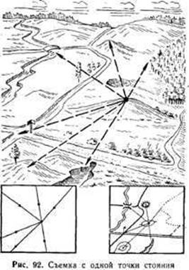 глазомерной съемки. Для проведения глазомерной съемки надо иметь компас, визирную линейку, карандаш, резинку и чистый лист бумаги, укрепленный на жесткой основе (кусок картона, фанеры и т. п.). В некоторых случаях, когда съемку нужно провести быстро и при этом не требуется особой тщательности, она может быть выполнена при наличии только карандаша и бумаги. Рассмотрим некоторые приемы глазомерной съемки, применяемые при составлении схем местности. Съемка с одной точки стояния применяется, когда на чертеже требуется показать небольшой участок местности, расположенный непосредственно вокруг точки стояния или в заданном секторе. В этом случае съемка выполняется способом кругового визирования в такой последовательности.