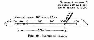 Съемка с нескольких точек стояния выполняется, когда требуется показать сравнительно большой участок местности. Местные предметы в этом случае наносят на чертеж засечками, промером расстояния, по створу, способом кругового визирования, способом перпендикуляров (см. разд. 5.2). При подготовке к съемке необходимо лист бумаги, на котором будет вестись съемка, закрепить на твердой основе (планшете). К этой же основе прикрепляется компас так, чтобы линия север—юг на шкале компаса была примерно параллельна одной из сторон планшета или листа бумаги. Для быстроты и удобства откладывания расстояний, измеренных шагами, необходимо изготовить масштаб шагов. Такой масштаб строится на отдельной полоске бумаги или на поле того листа, на котором ведется съемка. Масштаб шагов строится так. Допустим, что съемка ведется в масштабе 1:10000, т. е. 1 см на чертеже соответствует 100 м на местности. Величина одной пары шагов съемщика 1,5 м. Следовательно, 100 пар шагов равны 150 м на местности или 1,5 см на чертеже. Отрезок в 1,5 см откладывают на прямой линии три, четыре или большее число раз. Против второго деления слева подписывают цифру 0, а против последующих делений — цифры 100, 200, 300 и т. д. Против крайнего левого (первого) деления подписывают: 100 пар шагов. Таким образом получают масштаб шагов, каждое большое деление которого соответствует 100 парам шагов. Для того чтобы расстояния можно было откладывать с большей точностью, крайний левый отрезок делят на 10 малых делений по 1,5 мм, каждое из которых будет равно 10 парам шагов.