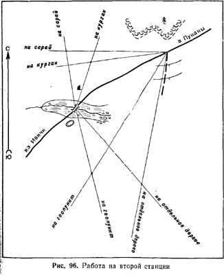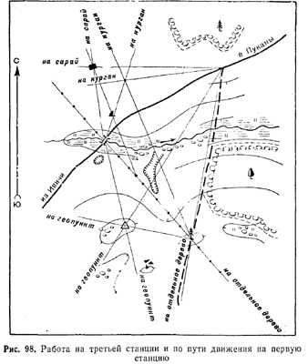 Имея такой масштаб, нет необходимости каждый раз переводить пары шагов в метры; достаточно отложить по масштабу пройденное число пар шагов, чтобы получить расстояние в масштабе съемки, которое и наносится на чертеж. Съемка ведется обходом участка по дорогам, берегу реки, опушке леса, вдоль линии связи и т. п. Направления, по которым ведется съемка, называются ходовыми линиями, а точки, на которых определяюгся и прочерчиваются направления новых ходовых линий,—станциями. Рассмотрим порядок съемки на следующем примере. На высоте с курганом осматривают участок местности и намечают ходовые линии по маршруту: мост—развилка грунтовой и полевой дорог—высота с отдельным деревом — мост. Работа на первой станции . Определив стороны горизонта и установив, что учасгок в основном расположен от первой станции (мост) на юго-восток, накалывают точку стояния в северо-западной части листа бумаги и прочерчивают на нем стрелку север— юг. Ориентируя планшет по компасу и не сбивая ориентировки, прочерчивают направление вдоль грунтовой дороги, а затем на все характерные ориентиры, видимые с точки стояния: отдельное дерево, геодезический пункт, сарай, курган. На этих линиях подписывают названия предметов. Затем способом кругового визирования наносят и вычерчивают мост (точка стояния), участок дороги от моста к юго-западу, участок реки до кустов, отдельный камень и яму, отмечают начало лощины вблизи моста и показывают заболоченный участок с луговой растительностью.