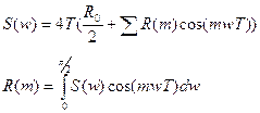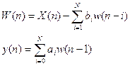 3. С помощью линейного предсказания. Это авто корреляционный способ. Он использует закономерность или информацию о том, как соседние отсчеты взаимосвязаны между собой. Для того, чтобы исследовать сигналы в частотной области с помощью программ, которые моделируют цифровые фильтры, необходимо, заранее делать расчет цифровых фильтров. Порядок расчета цифровых фильтров следующий: 1) Решается задача аппроксимации с целью определения коэффициента фильтра, при котором фильтр удовлетворяет заданному требованию. 2) Выбирается конкретная схема построения фильтра и квантования, найденных значений его коэффициентов в соответствии с фиксированной длиной слова. 3) Делается квантование переменных величин фильтра, т.е. выбор длины слова входных выходных и промежуточных переменных. 4) Проверяется методом моделирования, удовлетворяет ли полученный фильтр заданным требованиям. Если на этом этапе фильтр не удовлетворяет заданным требованиям, то предыдущие 2 и 3 этапы повторяются. Бывают 2 типа фильтров: а) Нерекуррентные. б) Рекуррентные. Формулы определения фильтров.