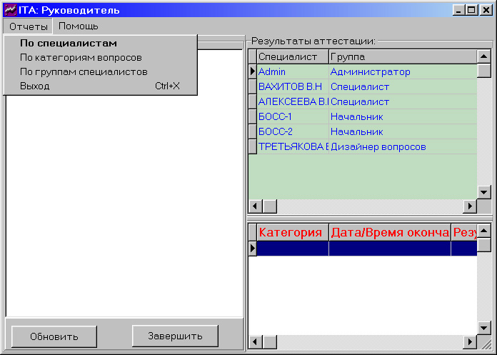 Компонент системы «Аттестация ИТ-специалистов», предназначен для использования администратором системы. Файл запуска - ita_adm.exe
