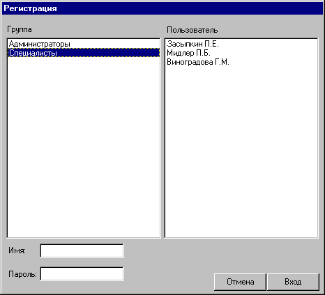 ыбрав группу и имя пользователя, необходимо ввести пароль и нажать кнопку «Вход в систему». Если пароль введён правильно, открывается главное