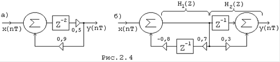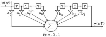 Предлагается определить самостоятельно импульсную реакцию цепи на рис.(2.6,а), применяя последовательно оба рассмотренных метода. В соответствии с определением передаточной функции, Z - изображение сигнала на выходе цепи можно определите как произведение Z - изображения сигнала на входе цепи и передаточной функции цепи: Y(Z) = X(Z)ЧH(Z). (2.11) Отсюда, по теореме о свертке, свертка входного сигнала с импульсной характеристикой дает сигнал на выходе цепи y(nT)