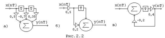 уравнение с постоянными коэффициентами am , b Разностное уравнение составляется непосредственно по схеме цепи, учитывая возможные пути прохождения сигнала, или по системным характеристикам цепи. Пример. Составить разностное уравнение цепи, схема которой приведена на Рис. 2.2, а. Решение. Здесь имеется три пути прохождения сигнала от входа до выхода цепи, по которым сигналы проходят и затем складываются в сумматоре. Поэтому разностное уравнение имеет вид y(nT) = 0,5 x(nT) - 0,7 x(nT - T) + 0,35 x(nT - 2T).