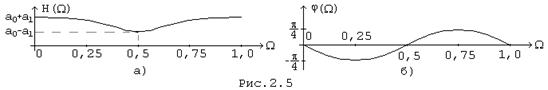 где W - нормированная частота. В расчетах с приенением ЭВМ нормирование по частоте становится необходимостью. Пример. Определить частотные характеристики цепи, передаточная функция которой H(Z) = a0 + a1ЧZ-1. Решение. Комплекс передаточной функции: H(jw) = a0 + a1e-jwT. с учетом нормирования по частоте: wT = 2p Ч W. Поэтому H(jw) = a0 + a1e-j2pW = a0 + a1 cos 2pW - ja1 sin 2pW . Формулы АЧХ и ФЧХ H(W) = графики АЧХ и ФЧХ для положительных значений a0 и a1 при условии a0 > a1 приведены на рис.(2.5,а,б.)