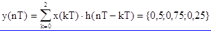 Выравниваем периоды сигналов для применения круговой свёртки: N = N1 + N2- 1 = 3. Следовательно x0(nT)= {0; 0,4;