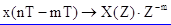 Пример. Определить сигнал на выходе цепи (рис 2.2,в), если y(nT)={0,1; 0,1}. Решение. Цепь содержит обратную связь (ОС), поэтому сигнал на выходе цепи формируется как сигнал со стороны входа, так и со стороны выхода. y(nT) = 0,4 x(nT-T) - 0,08 y(nT-T) n=0 y(0T) = 0,4 x(-T) - 0,08 y(-T) = 0 n=1 y(1T) = 0,4 x(0T) - 0,08 y(0T) = 0,4 n=2 y(0T) = 0,4 x(1T) - 0,08 y(1T) = 0,368 и т.д. ... Следовательно y(nT) = {0; 0,4; 0,368; ...}. В данном случае за счет циркуляции сигнала по цепи ОС выходной сигнал состоит из бесконечного числа отсчетов. Дискретная цепь, содержащая ОС, называется рекурсивной. Дискретная цепь без ОС называется нерекурсивной. Передаточная функция дискретной цепи Замена сигналов в разностном уравнении (2.1) на Z - изображения этих сигналов