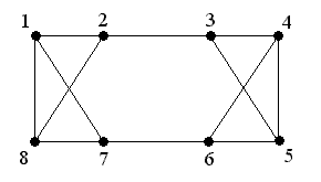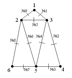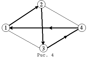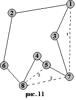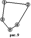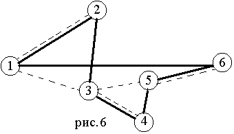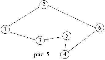u u→S {положить u в стек} Г[v]:=Г[v]\{u}; Г[u]:=Г[u]\{v} {удалить ребро (v,u)} end if end while Обоснование алгоритма. Принцип действия этого алгоритма заключается в следующем. Начиная с произвольной вершины, строим путь, удаляя ребра и запоминая вершины в стеке, до тех пор пока множество смежности очередной вершины не окажется пустым, что означает, что путь удлинить нельзя. Заметим, что при этом мы с необходимостью придем в ту вершину, с которой начали. В противном случае это означало бы, что вершина v имеет нечетную степень, что невозможно по условию. Таким образом, из графа были удалены ребра цикла, а вершины цикла были сохранены в стеке S. Заметим, что при этом степени всех вершин остались четными. Далее вершина v выводится в качестве первой вершины эйлерова цикла, а процесс продолжается, начиная с вершины, стоящей на вершине стека. Мне бы хотелось привести здесь еще один алгоритм построения эйлерова цикла в эйлеровом графе — это Алгоритм Флёри, он позволяет пронумеровать ребра исходного графа так, чтобы номер ребра указывал каким по счету это ребро войдет эйлеров цикл. Алгоритм Флёри: 1. Начиная с любой вершины v присваиваем ребру vu номер 1. Вычеркиваем это ребро из списка ребер и переходим к вершине u. 2. Пусть w - вершина, в которую мы пришли в результате выполнения 1 шага алгоритма и k - номер, присвоенный очередному ребру на этом шаге. Выбираем произвольное ребро инцидентное вершине w, причем мост выбираем только в крайнем случае, если других возможностей выбора ребра не существует. Присваиваем ребру номер k+1 и вычеркиваем его. Процесс длится до тех пор, пока все ребра не вычеркнут. Примечание: Мостом называется ребро, удаление которого лишает данный граф связности, т.е. увеличивает число компонент связности. Пример: