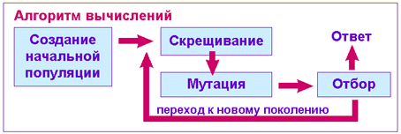 Чтобы смоделировать эволюционный процесс, сгенерируем вначале случайную популяцию - несколько индивидуумов со случайным набором хромосом (числовых векторов). Генетический алгоритм имитирует эволюцию этой популяции как циклический процесс скрещивания индивидуумов и смены поколений. Жизненный цикл популяции - это несколько случайных скрещиваний (посредством кроссовера) и мутаций, в результате которых к популяции добавляется какое-то количество новых индивидуумов. Отбором в генетическом алгоритме называется процесс формирования новой популяции из старой популяции, после чего старая популяция погибает. После отбора к новой популяции опять применяются операции кроссовера и мутации, затем опять происходит отбор, и так далее. Отбор в генетическом алгоритме тесно связан с принципами естественного отбора в природе следующим образом:
