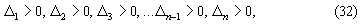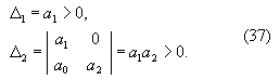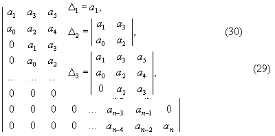 Для устойчивости линейной системы n-го порядка необходимо и достаточно, чтобы все n частных определителей Гурвица Δν, ν=1,2,..n, получаемых из общего определителя (30), (31), составленного из коэффициентов а0, а1, а2,...аn характеристического уравнения (17), были положительны: