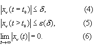 Затем при следующих выражениях: Ляпунов дал следующее определение устойчивости. Невозмущенное движение называется устойчивым, если для всякого небольшого положительного числа δ>0 может быть найдено другое такое число ε(δ), чтобы для всех возмущенных движений yν(t) для начального момента времени t = t0 выполнялось неравенство (4), а во все последующие моменты времени t > t0 было справедливо неравенство (5). В противном случае невозмущенное движение неустойчиво. Иными словами невозмущенное движение устойчиво, если, будучи возмущено в начальный момент времени оно в дальнейшем целиком проходит в непосредственной окрестности своего первоначального состояния и не покидает эту соседнюю область. Из данного определения устойчивости движения получается устойчивость положения равновесия как частный случай, когда все fν(t)=Сν, т.е. являются постоянными величинами. Более жестким, чем только что данное определение, является определение асимптотической устойчивости. А именно, невозмущенное движение называется асимптотически устойчивым, если оно, во-первых, устойчиво в смысле вышеуказанного определения (4), (5), и, во-вторых, если можно выбрать число δ такое, чтобы для всех возмущенных движений, которые удовлетворяют неравенству (4) дополнительно выполнялось условие (6). Другими словами это означает, что при возмущенном в начальный момент времени t=t0 асимптотически устойчивом движении возмущения не только остаются внутри окрестности первоначального состояния ε(δ), как при нормальной устойчивости, но и дополнительно с течением времени затухают до нуля. Итак, возмущенное движение устойчиво, если возмущенное в начальный момент времени движение проходит в его непосредственной окрестности и не покидает определенную соседнюю область. Оно асимптотически устойчиво, если возмущенное движение асимптотически стремится к невозмущенному. Приведенное определение устойчивости называется устойчивым «в малом». Наряду с ним часто пользуются понятиями об устойчивости «в большом» и «в целом», которые характеризуют поведение движения по отношению к большим начальным возмущениям из определенной области или даже для произвольных начальных возмущений. Такие случаи часто имеют существенное значение в некоторых задачах. Однако во многих практически важных задачах вполне достаточным оказывается исследование устойчивости «в малом». Именно этот вариант и будет рассматриваться в дальнейшем изложении. Дифференциальные уравнения возмущенного движения; уравнения первого приближения.