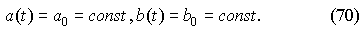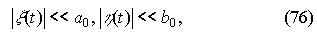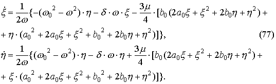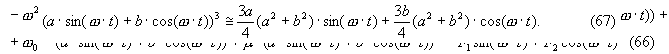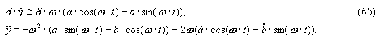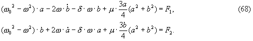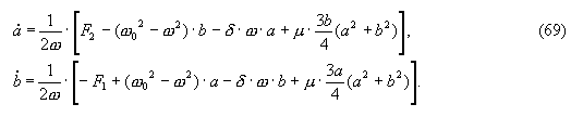 При исследовании устойчивости для описания поведения рассматриваемой системы при появлении малых возмущений необходимо использовать полную подстановку Ван дер Поля: где a(t), b(t) – медленно изменяющиеся функции. Вычислим первую и вторую производные функции y(t) по времени t: |
