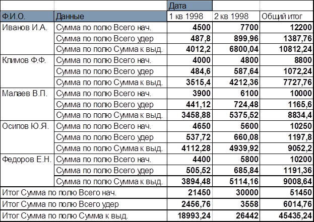 Применение нескольких итоговых функций к одному полю К полю можно применить любое количество итоговых функций. Чтобы использовать дополнительные функции для поля , которое уже находится в области данных сводной таблицы , выделим любую ячейку в области данных и нажмем кнопку Поле сводной таблицы на панели инструментов. Оказавшись в окне диалога Мастер сводных таблиц - шаг 3 из 4 перетащим в область данных диаграммы макета кнопку этого же поля еще раз , чтобы разместить вторую копию заголовка поля. Дважды щелкнув на копии заголовка , затем в списке Операция окна диалога Вычисление поля сводной таблицы выберем нужную итоговую функцию и нажмем кнопку ОК , чтобы вернуться в сводную таблицу. Ссылки на данные в сводной таблице Если формула рабочего листа использует для получения данных из сводной таблицы обычную ссылку на ячейку , то она будет прекрасно работать , пока ячейка остается на своем месте. Но после реорганизации сводной таблицы эта формула возвратит неверные данные. Чтобы избежать этого , используем в формуле функцию ПОЛУЧИТЬ.ДАННЫЕ. СВОДНОЙ. ТАБЛИЦЫ для создания ссылки на данные сводной таблицы. Функция ПОЛУЧИТЬ. ДАННЫЕ. СВОДНОЙ. ТАБЛИЦЫ имеет два аргумента. Первый аргумент служит для указания сводной таблицы , а второй аргумент описывает извлекаемые данные. Первый аргумент может быть любой ячейкой сводной таблицы или именем диапазона , назначенного сводной таблице , а так же надписью , записанной в ячейке над левым верхним углом таблицы. Второй аргумент , заключаемый в двойные кавычки , перечисляет имена полей , на пересечении которых находятся извлекаемые данные. Имена полей во втором аргументе должны быть разделены пробелом. Использование сводной таблицы для консолидации диапазонов С помощью мастера сводных таблиц можно консолидировать данные из таблиц , расположенных на разных рабочих листах Excel. Непременным условием такой консолидации является единая структура таблиц. При этом каждая таблица должна содержать данные одного временного диапазона. Например , ведомости зарплаты за каждый квартал 1998года сформированы на разных рабочих листах Excel с именами 1кв -98 , 2кв -98 , 3кв -98 , 4кв -98. Для построения сводной ведомости за весь 1998 год не обязательно переносить их на один рабочий лист EXCEL , а можно воспользоваться средством консолидации мастера сводных таблиц. Для создания консолидированной сводной таблицы из нескольких рабочих листов надо выполнить следующие действия. Перейти на новый рабочий лист и выбрать в меню Данные команду Сводная таблица. На первом шаге мастера сводных таблиц надо установить флажок в нескольких диапазонах консолидации. На следующем шаге мастера сводных таблиц следует оставить установленным по умолчанию переключатель Создать одно поле страницы. Далее необходимо указать диапазон каждой консолидируемой таблицы , включая в него заголовки столбцов и строк , кроме итоговых строк и столбцов. После задания всех диапазонов объединяемых таблиц по кнопке Далее можно перейти к третьему шагу , который выводит окно формирования макета итогового документа , за исключением того , что Excel не отображает имена полей завершения формирования сводной таблицы. Для суммирования значений из исходных диапазонов достаточно нажать кнопку Далее , а для использования другой итоговой функции следует дважды щелкнуть