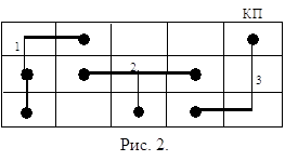 Цель оптимизации – максимизация F1.По своей сути максимизация F1 совпадает с максимизацией cmin. В качестве другого критерия оптимизации можно использовать другую характеристику. Обозначим через g число ребер графа G для которых ci имеет отрицательное значение. Очевидно, что целью генетического поиска должен быть поиск решения (индивидуальности) у которого g имеет минимальное значение. Пусть m – число всех ребер графа G. Введем фитнесс F2=m - g. Цель оптимизации в таком случае – максимизация F2 Если при оптимизации по критерию F1 не удается найти такого решения при котором у всех ребер ui Î G, соответствующие им сi имеют положительные значения, то оптимизация по критерию F2 минимизирует число таких ребер. Это делается из следующих соображений: чтобы обеспечить 100% реализацию (разводки) соединений, потребуется меньшее число деформаций областей или границ. Обозначим через j число ребер всех цепей, для которых выбранные и реализованные варианты соединений включают ребра ui графа G с отрицательными значениями сi. Пусть Nd – общее число ребер всех максимальных связывающих деревьев. Введем третий критерий оптимизации: F3=Nd - j Цель оптимизации заключается в максимизации F3. Это обеспечивает минимальное число соединений, требующих перетрассировки, т.е. оптимизация по F3 уменьшает число перетрассируемых соединений. Если при оптимизации по F1, имеются ребра с отрицательными сi, то в зависимости от метода дотрассировки, деформации областей или границ, используется критерий F2 или F3. 3. Разработка генетических процедур для задачи глобальной трассировки 3.1. Кодирование и декодирование хромосом Для решения задачи глобальной трассировки используются генетические методы оптимизации. Представим решение в виде хромосомы. Кодирование осуществляется следующим образом. Хромосома состоит из генов. Количество генов в хромосоме Hi равно количеству ребер минимальных связывающих деревьев для всех цепей, расположенных на КП. Значением гена является номер варианта из заданного набора вариантов маршрутов, связывающих на графе G соответствующие вершины. Например, дано КП, на котором расположено множество цепей Т = {t1, t2, t3} , рис. 2.
