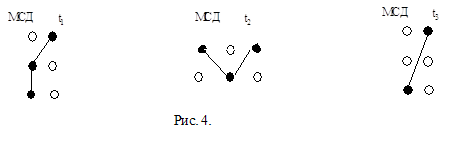 Рис. 5 Число генов равно 5. Гены g1 и g2 соответствуют ребрам r11 и r12 дерева D1; g3 и g4 соответствуют ребрам r21 и r22 дерева D2; g5 соответствует ребру r31 дерева D3. Значение g1 равно 2, т.к. для реализации r11 выбран вариант V112. g2 равно 1, т.к. r12 реализован вариантом V121. Аналогично, т.к. r21,r22 и r31 реализованы соответственно вариантами V211, V221 и V313, то g3=1, g4=1, g5=3. Отметим, что между структурой и видом хромосомы с одной стороны и решением (распределением соединений на КП) с другой стороны существует взаимно - однозначное соответствие. Отличительной особенностью предложенной структуры хромосомы является то, что отсутствует какая либо зависимость между генами, обусловленная самой структурой. Это свойство исключает возможность появления нелегальных хромосом, подобно тому, как это происходит с хромосомами, представляющими собой списковые структуры. В свою очередь это упрощает реализацию рассматриваемых ниже генетических операторов. Пусть L – число всех