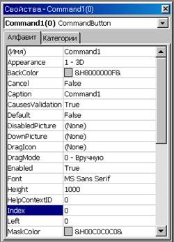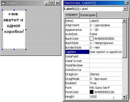 У меня заняло меньше времени выполнить то, что я вам описал выше. Такие приготовления нам были просто необходимы, потому что программный код будет совсем другим! Вот его листинг: Private Sub Form_Load() For i = 0 To 8 Command1(i).Caption = Int(9 * Rnd) Next i End Sub Private Sub Command1_Click(Index As Integer) For i = 0 To 8 If Command1(Index).Caption < Command1(i).Caption Then End Next i Command1(Index).Visible = False Command1(Index).Caption = -1 End Sub Если вы предположите, что объём проекта первого подхода больше, чем при другом подходе, то будете совершенно правы (8,71 Кб и 4,25 Кб соответственно). Однако, более подробные объяснения как создавать и обращаться к массивам элементов управления изложим на следующем примере и после него. Пример второй или "спички детям - не игрушка!" Представьте, перед вами выложили два коробка, один из которых пустой, а другой наполнен спичками. Далее вам предлагают выбрать любой из них. Если вы выберите из двух пустой коробок, то вы выиграли, в противном случае - к двум имеющимся добавят ещё один спичечный коробок и перемешают их тайным для вас образом. После выбора пустого коробка среди трёх, перед вами окажется два, иначе - добавят ещё один и таким же методом. Игра оканчивается не в вашу пользу, если число коробков превысит девяти. Представим данную программу в виде приложения! Для разнообразия, используем инструмент Label (метка). Разместим выбранный инструмент на форме ближе к левому краю. Ширина брошенной метки должна быть в десять-одиннадцать раз меньше ширины максимизированного окна. Свойство Index равно единице. Свойство BackColor должно выделять всю метку. Свойство Caption лучше изменить.