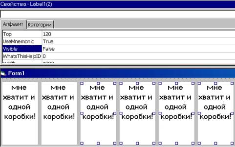 skolko = 2 End Sub Private Sub Label1_Click(Index As Integer) If Fix(skolko * Rnd) + 1 = Index Then ' если "угадали" - одна убирается Label1(skolko).Visible = False skolko = skolko - 1 Else ' если не угадали - выставляется ещё одна Label1(skolko + 1).Left = Label1(skolko).Left + Label1(skolko).Width + 60 Label1(skolko + 1).Visible = True skolko = skolko + 1 End If Select Case skolko ' проверка на выигрыш и проигрыш Case 1 MsgBox "Вы выиграли!": End Case 10 MsgBox "Вы проиграли.": End End Select End Sub Отсюда делаем вывод: "обращаются к элементам массива объекта следующим образом ... Пишут имя массива объектов, затем в скобках выражение, указывающее индекс элемента и уж после через точку то свойство, которое хотят либо изменить, либо прочитать". Умозаключение приятно как, по сути, так и по форме. Однако, возможна ли ошибка при обращении к элементу? Да возможна, но ... Но об этом чуть позже. Теперь другой вопрос. В предыдущем примере я показал два варианта реализации задачи: без использования массива объектов и с использованием его. А можно ли реализовать как-то по-другому решение данной игры, но всё-таки тоже используя массив объектов. Да, можно. Рассматриваем ту же задачу, те же коробки, с использованием тех же массивов элементов ( ... но "как-то по-другому ..." ). Всё таже форма, всё тот же Label1(0), всё таже клавиатура ... На метке выполняем комбинацию клавиш Ctrl + C, затем Ctrl + V (отвечая положительно на появившийся вопрос диалогового окна среды разработки). Разместите появившуюся метку правее от имевшейся метки. Повторите ещё: Ctrl + V и разместите правее второй. Продолжайте повторение до тех пор пока не разместите метку Label1(9) правее метки Label1(8). Теперь выделите имеющиеся метки с индексами больше единицы. И измените свойства этих меток на противоположное - False. Label1(1) и Label1(0) поменяйте местами.