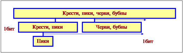 В этом примере приблизительно 5,5 бит информации. Пример: Определите методом дихотомии, сколько информации содержится в ответе на вопрос: «Какая масть выпадет при случайном вытаскивании карты из колоды.» 6