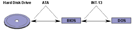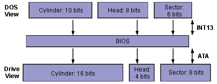 Рисунок 1. Перемычки для установки режима Master/SlaveОграниченность АТА Первоначальная версия стандарта IDE обеспечивала возможность подключения к компьютеру четырех винчестеров и позволяла обмениваться данными с диском на скорости до 10Мбайт/сек, однако реальная скорость ограничивалась прежде всего возможностями самого винчестера. Подключение четырех устройств, предусмотренное спецификацией IDE, в компьютерах семейства IBM PC AT, в спецификации ATA/IDE реализовано не было. Кроме того, совместное использование стандарта ATA и программного интерфейса Int 13 BIOS ограничивало размер дисковых устройств 528Мб. Природу этого ограничения, связанную с форматами чисел, используемых для адресации головок, секторов и цилиндров винчестера (CHS-адрес) в стандарте IDE и BIOS, можно понять из приведенной ниже таблицы и рисунка 2, иллюстрирующего взаимодействие операционной системы с диском IDE. Таблица 1.